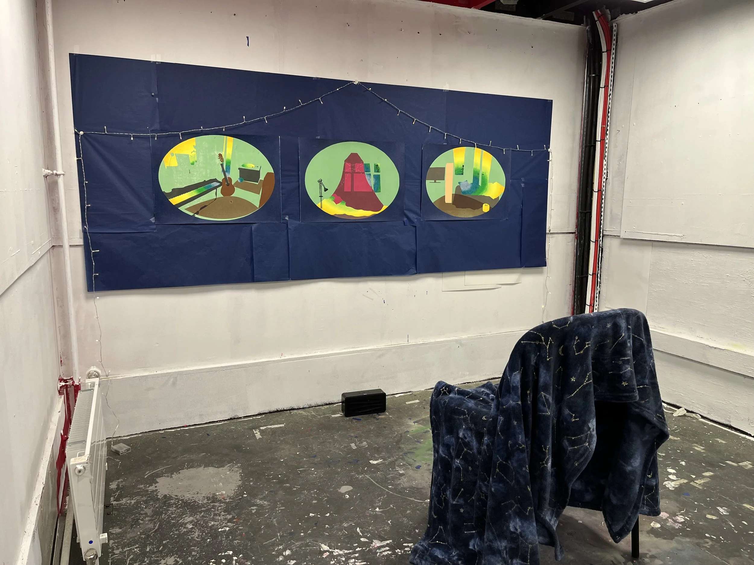 This project explores the abstract concept of comfort and how to express this with physical works. I have used my personal comfort songs and space to create artworks that try to capture viewers’ attention, giving them a moments escape from their day. The work invites a moment of reflection on and nostalgia for the viewers own comfort space.